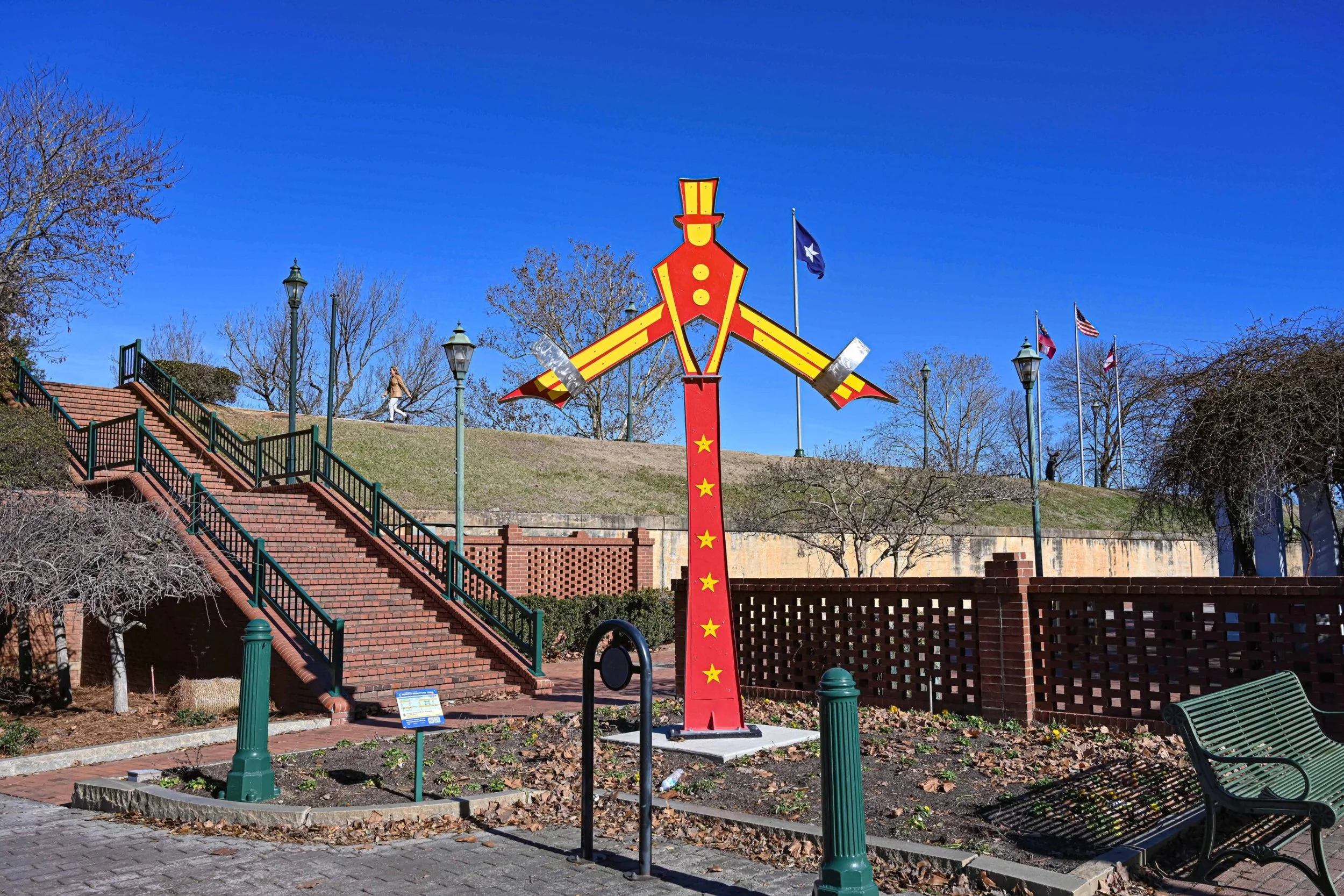 A short drive east brings you to this 16-foot aluminum tower unveiled in November 2023. Created by Gus and Lina Ocamposilva - a husband-and-wife team with their studio right here in Oldsmar , it celebrates the athletes who've poured their dedication into the Sports Complex over the years. Five-point stars anchor the top, each one crowned with a figure representing a different sport: baseball, football, soccer, hockey, and BMX. The red and yellow color story is intentional - vitality, enthusiasm, and the heat of competition. The artists pass it on their daily commute to their studio, which they say makes finishing it bittersweet in the best way.